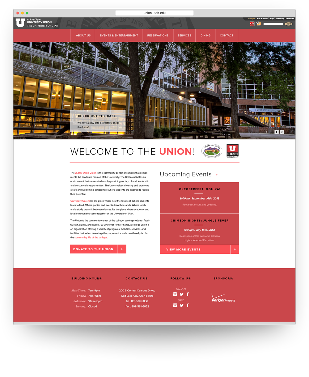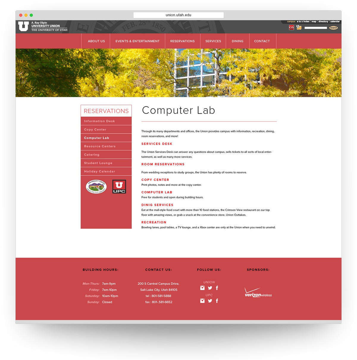 The University of Utah Union needed a site that was easy to navigate. Users had difficulty finding basic things like a build map and lists of organizations within the building. I was commissioned to organize content and create layouts for multiple pages to improve the ease of navigation. The site was built using WordPress so that it was easy to update by multiple departments within the Union. The site is now maintained by Union administration.